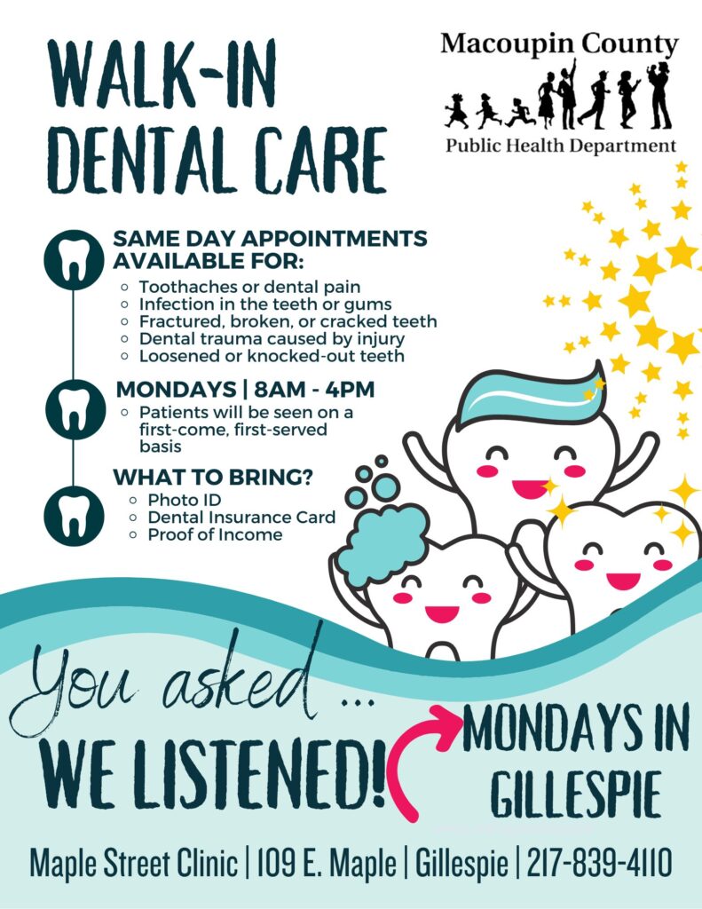 Macoupin County Public Health Department listened to the needs of the community and opened Maple Street Clinic located in Gillespie. The clinic’s collaborative approach provides evidence-based care, including medical, dental, and behavioral health services to Macoupin County and surrounding areas. Maple Street Clinic is committed to helping our communities thrive as we continue to prioritize the health and well being of our residents. We strive to provide comprehensive and compassionate care for all patients regardless of age, race, or income.